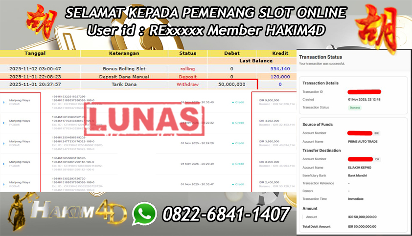 Selamat Kepada Member Hakimtoto dengan User ID : RE****, hari ini tanggal 01 November 2025 berhasil memenangkan JP di permainan slot gacor maxwin PG Soft hari ini dengan nominal sebesar Rp 50.000.000 dan sudah di bayar LUNAS!