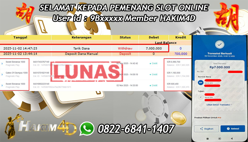 Selamat Kepada Member Hakimtoto dengan User ID : 9B*****, hari ini tanggal 02 November 2025 berhasil memenangkan JP di permainan slot gacor maxwin Pragmatic Play hari ini dengan nominal sebesar Rp 7.000.000 dan sudah di bayar LUNAS!!