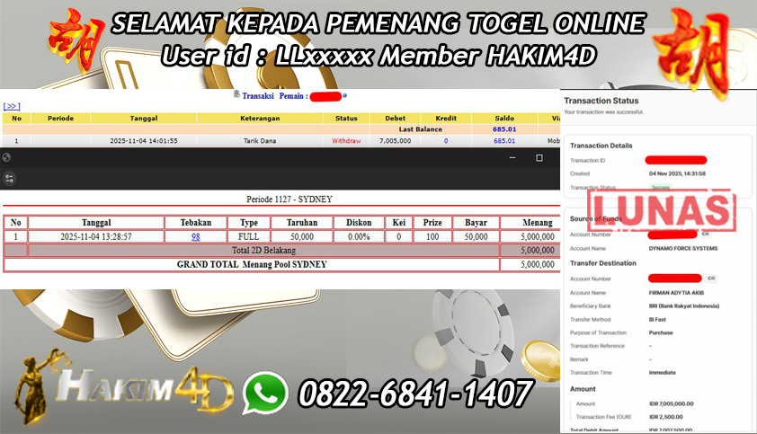 Selamat kepada User id Hakimtoto : LL*** pada hari ini, tanggal 04 November 2023 berhasil memenangkan JP Paus di permainan Togel Sydney dengan total hadiah kemenangan Rp. 7.005.000 dan Di BAYAR LUNAS!!
