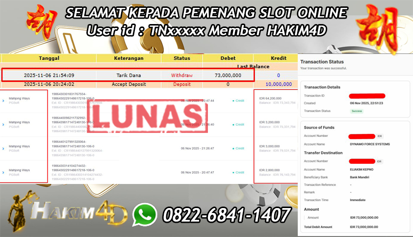 Selamat Kepada Member Hakimtoto dengan User ID : TN****, hari ini tanggal 06 November 2025 berhasil memenangkan JP di permainan slot gacor maxwin PG Soft hari ini dengan nominal sebesar Rp 73.000.000 dan sudah di bayar LUNAS!