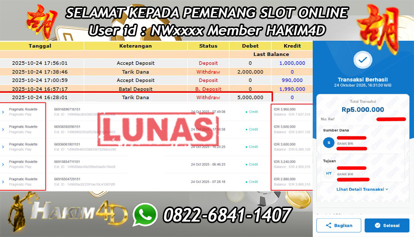 Selamat Kepada Member Hakimtoto dengan User ID : WI***, hari ini tanggal 21 Oktober 2025 berhasil memenangkan JP di permainan slot gacor maxwin Pragmatic Play hari ini dengan nominal sebesar Rp 6.900.000 dan sudah di bayar LUNAS!!