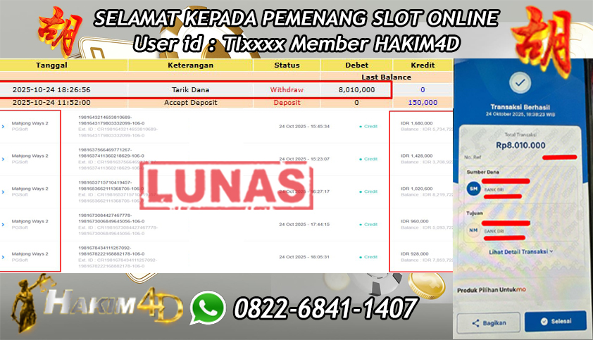 Selamat Kepada Member Hakimtoto dengan User ID : TI****, hari ini tanggal 24 Oktober 2025 berhasil memenangkan JP di permainan slot gacor maxwin PG Soft hari ini dengan nominal sebesar Rp 8.010.000 dan sudah di bayar LUNAS!