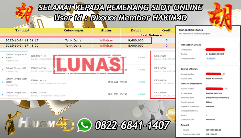 Selamat Kepada Member Hakimtoto dengan User ID : DI***, hari ini tanggal 24 Oktober 2025 berhasil memenangkan JP di permainan slot gacor maxwin Pragmatic Play hari ini dengan nominal sebesar Rp 9.600.000 dan sudah di bayar LUNAS!!