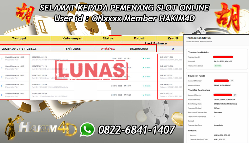 Selamat Kepada Member Hakimtoto dengan User ID : EM*****, hari ini tanggal 24 Oktober 2025 berhasil memenangkan JP di permainan slot gacor maxwin Pragmatic Play hari ini dengan nominal sebesar Rp 56.800.000 dan sudah di bayar LUNAS!!