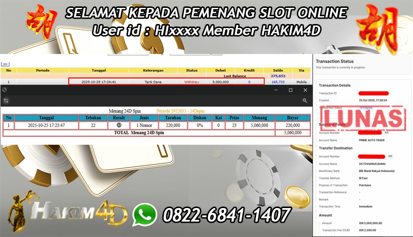 Selamat Kepada Member Hakimtoto dengan User ID: HI*****, hari ini tanggal 25 Oktober 2025 berhasil memenangkan JP di permainan live casino 24D Spin hari ini dengan nominal sebesar Rp 5.000.000 dan sudah di bayar LUNAS!!