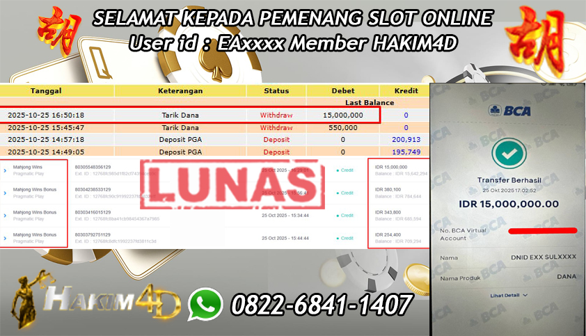 Selamat Kepada Member Hakimtoto dengan User ID : EA**, hari ini tanggal 25 Oktober 2025 berhasil memenangkan JP di permainan slot gacor maxwin Pragmatic Play hari ini dengan nominal sebesar Rp 15.000.000 dan sudah di bayar LUNAS!!
