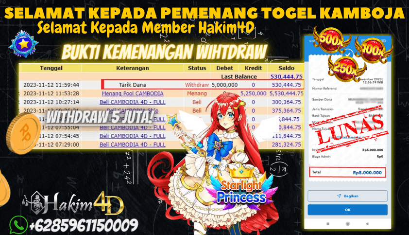 Selamat Kepada Member Hakimtoto dengan User ID: V*****0* karena berhasil memenangkan JP Paus dari permainan Togel Online Pasaran Cambodia Pools hari ini. Sudah Withdraw Rp 18.700.000 dan sudah di bayar LUNAS!