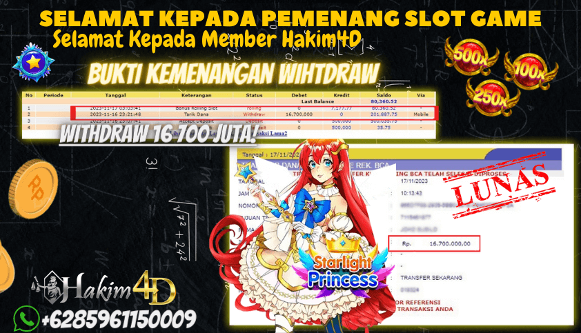 Selamat Kepada Member Hakimtoto dengan User ID: j*****, hari ini tanggal 16 Mei 2023 berhasil memenangkan JP di permainan slot gacor maxwin pragmatic play hari ini dengan nominal sebesar Rp 10.500.000 dan sudah di bayar LUNAS!!